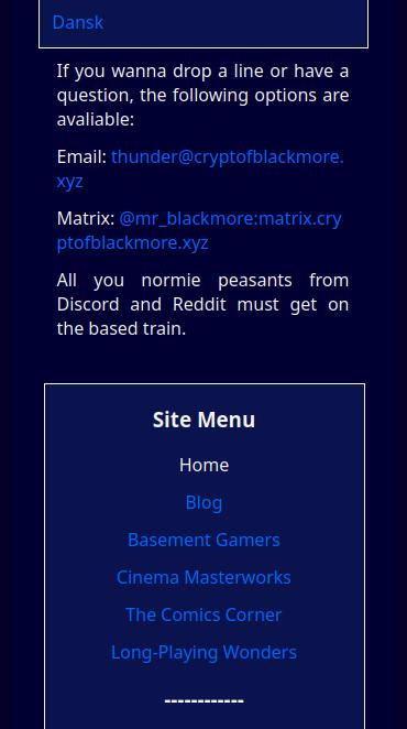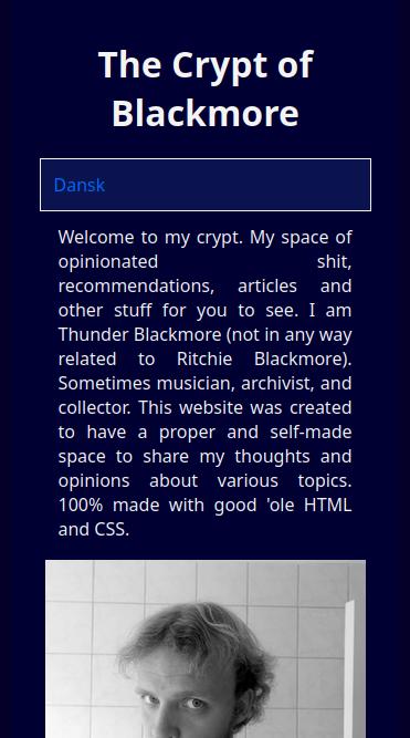 For folk med telefonere, så har jeg flyttet sidemenuen til bunden af alle sider for let tilgængelighed. Jeg kunne måske have opholdt det som en sidebar overlap, men jeg ved ikke hvordan, og siden at jeg alligevel vil have denne hjemmeside til at være let, minimalistisk og hurtig, så kan jeg forestille mig, at det ville tage noget fra sidens performance. Desuden er det her hurtigt nok.