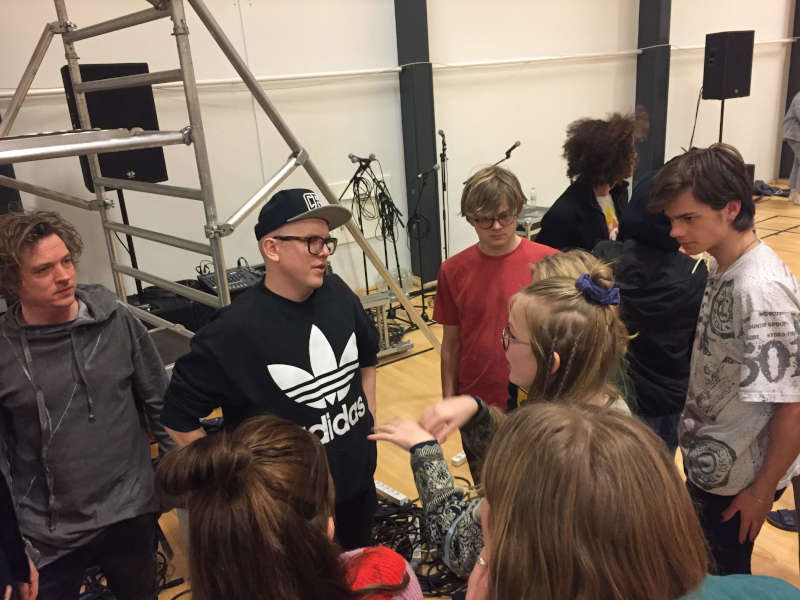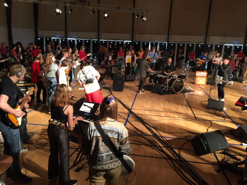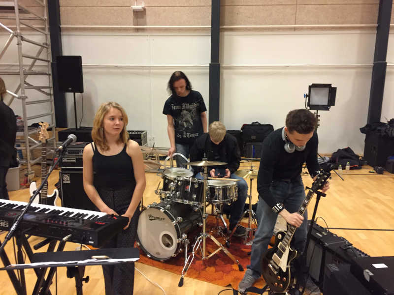 I remember being a bit nervous before the shoot, because I was still struggling to keep in time with the drums. Even knowing that it would be playback, the idea of multiple drummers playing the same thing at the same time to the same beat seemed to be somewhat of a daunting task. Especially, when it ended on being 20 bands from 6 different schools. Because our school was a small all-around-type efterskole, our one band was really all that our school could contribute to this, compared to the others that specialized in music performance. Luckily, I got introduced to the marvelous technology of in-ear monitors. With these, I could block most of the noise out and really focus on the song and the click.