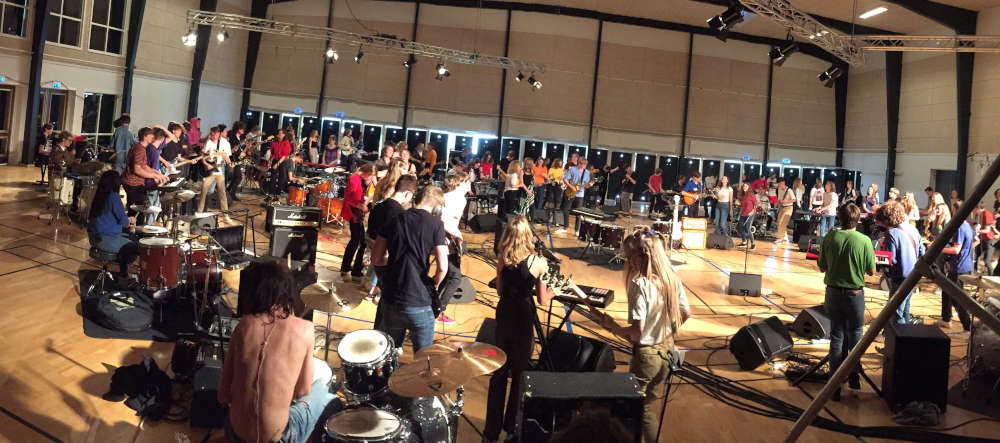 I remember being a bit nervous before the shoot, because I was still struggling to keep in time with the drums. Even knowing that it would be playback, the idea of multiple drummers playing the same thing at the same time to the same beat seemed to be somewhat of a daunting task. Especially, when it ended on being 20 bands from 6 different schools. Because our school was a small all-around-type efterskole, our one band was really all that our school could contribute to this, compared to the others that specialized in music performance. Luckily, I got introduced to the marvelous technology of in-ear monitors. With these, I could block most of the noise out and really focus on the song and the click.